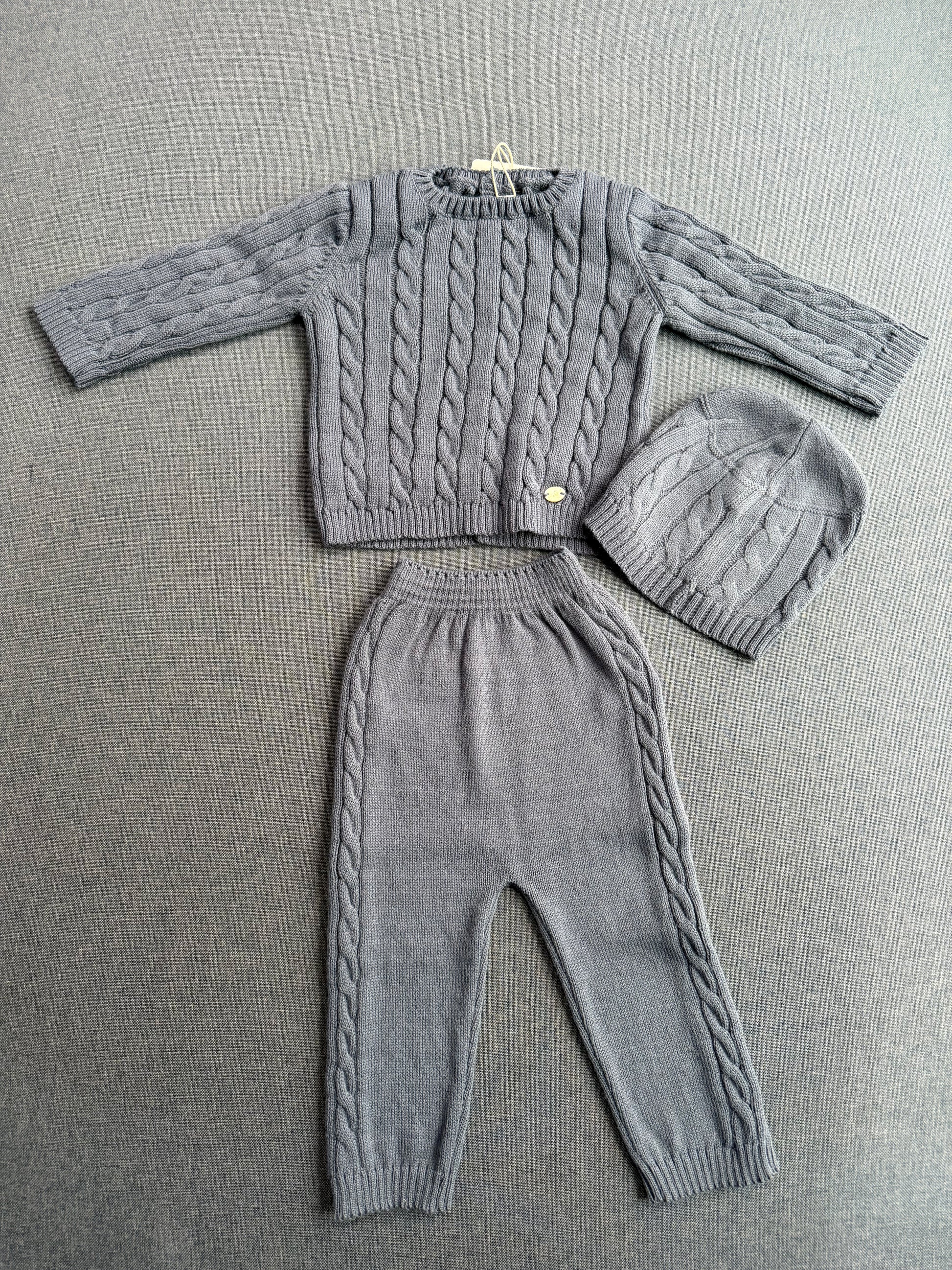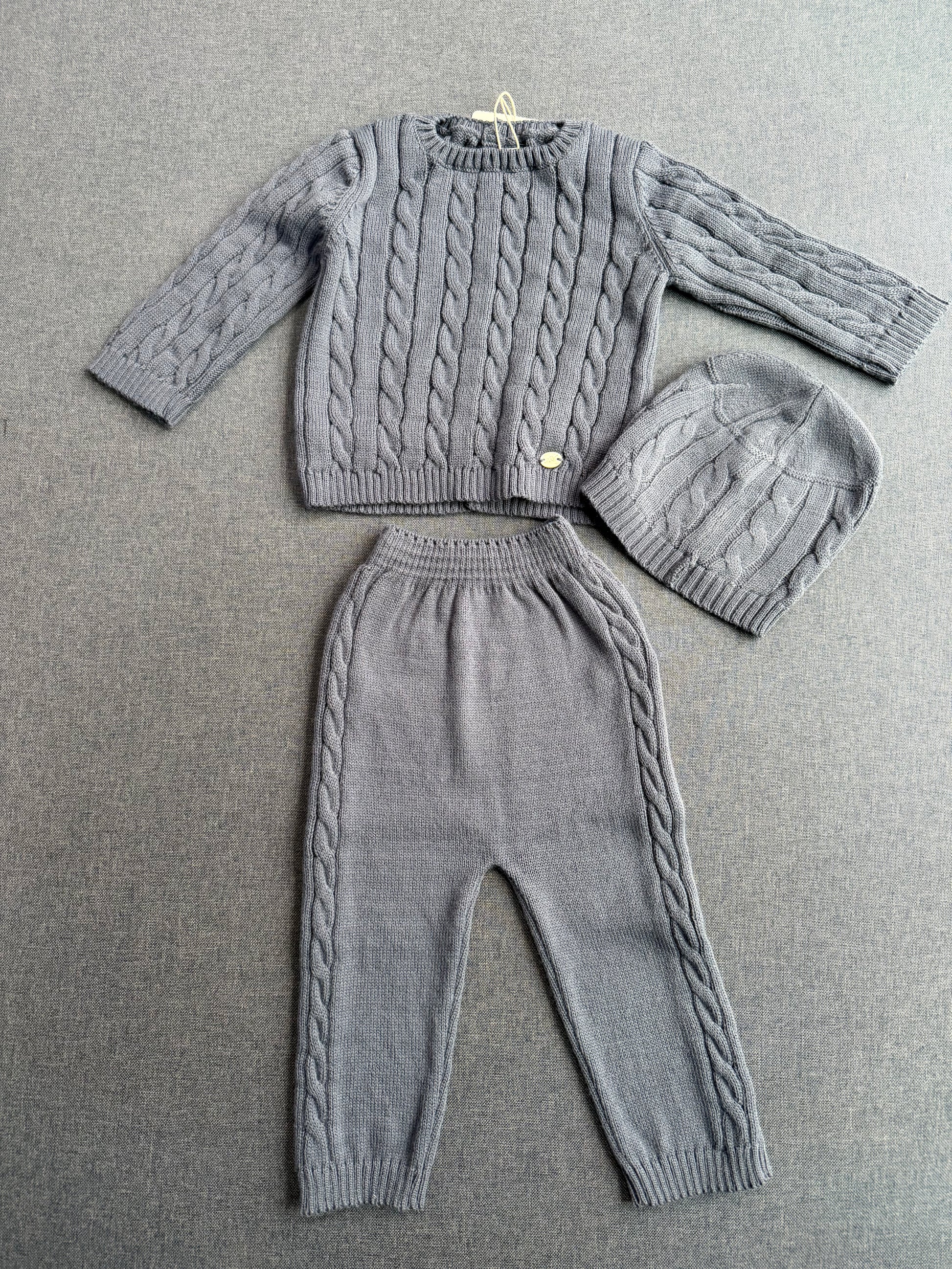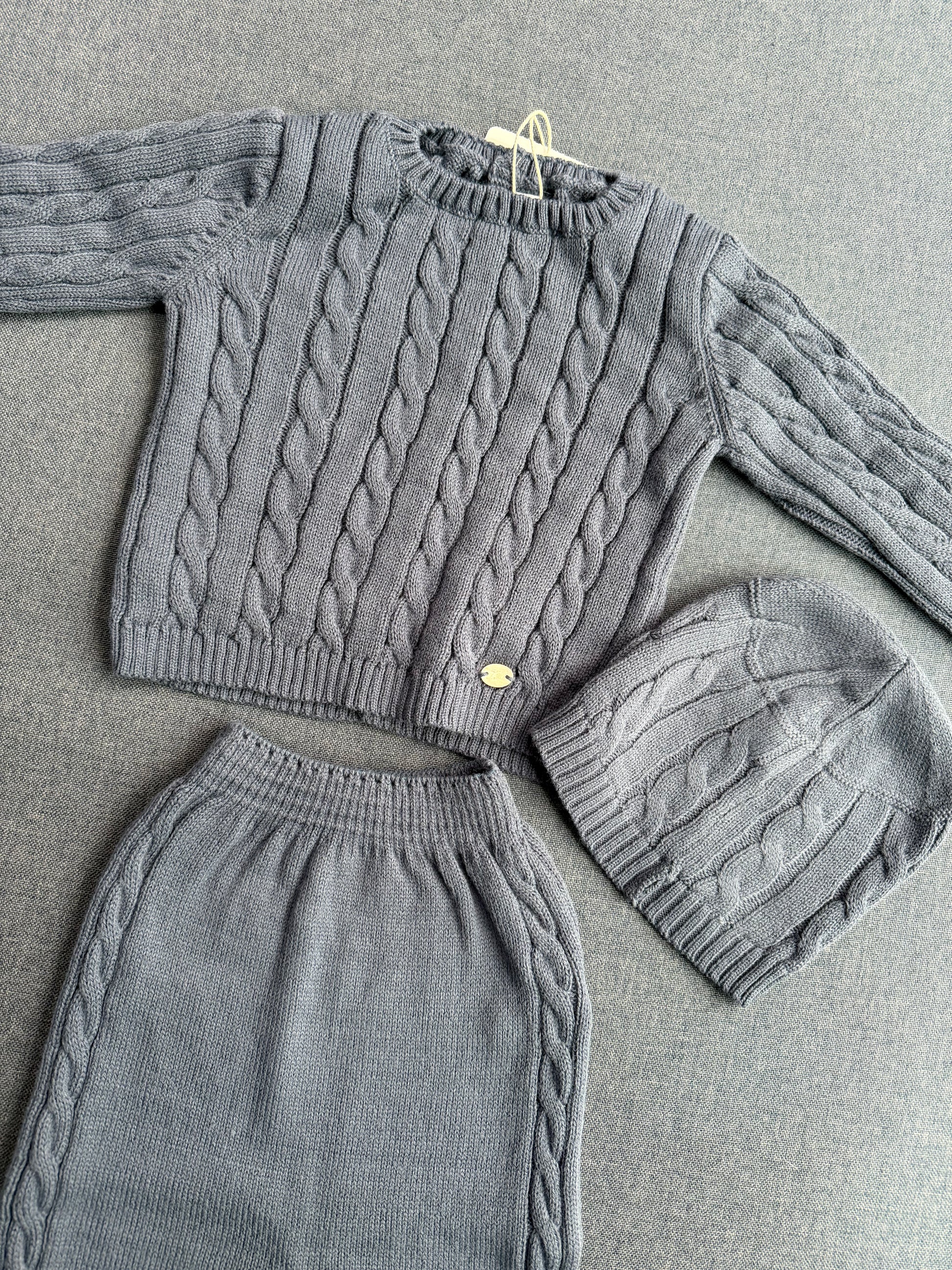 Hermoso conjunto de punto super lindo en color azul noche (entre marino y oscuro) en tejido de punto. Sueter, pantalón y gorro.