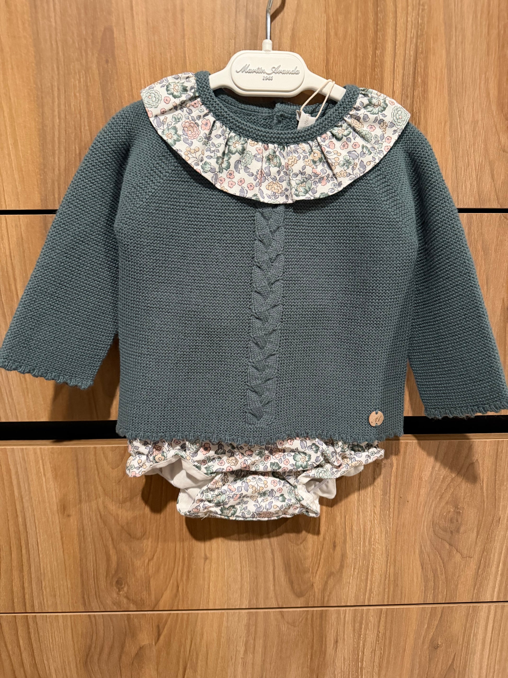 Precioso conjunto de cubre pañal y suéter/blusa de tejido de punto en coloro verde botella, imaginativo con unas mallas o unas calcetas altas. Ajuste de botones en la parte de la espalda, detalle de plan en cuello.