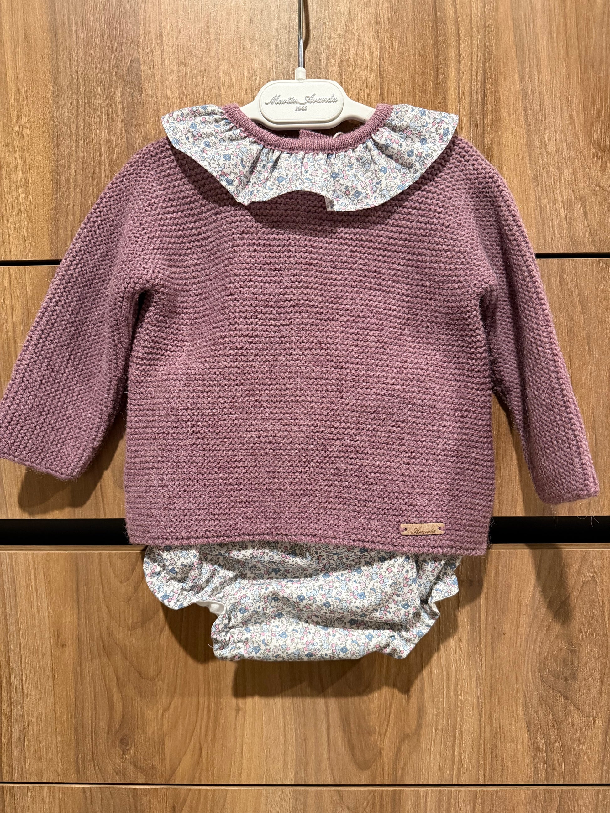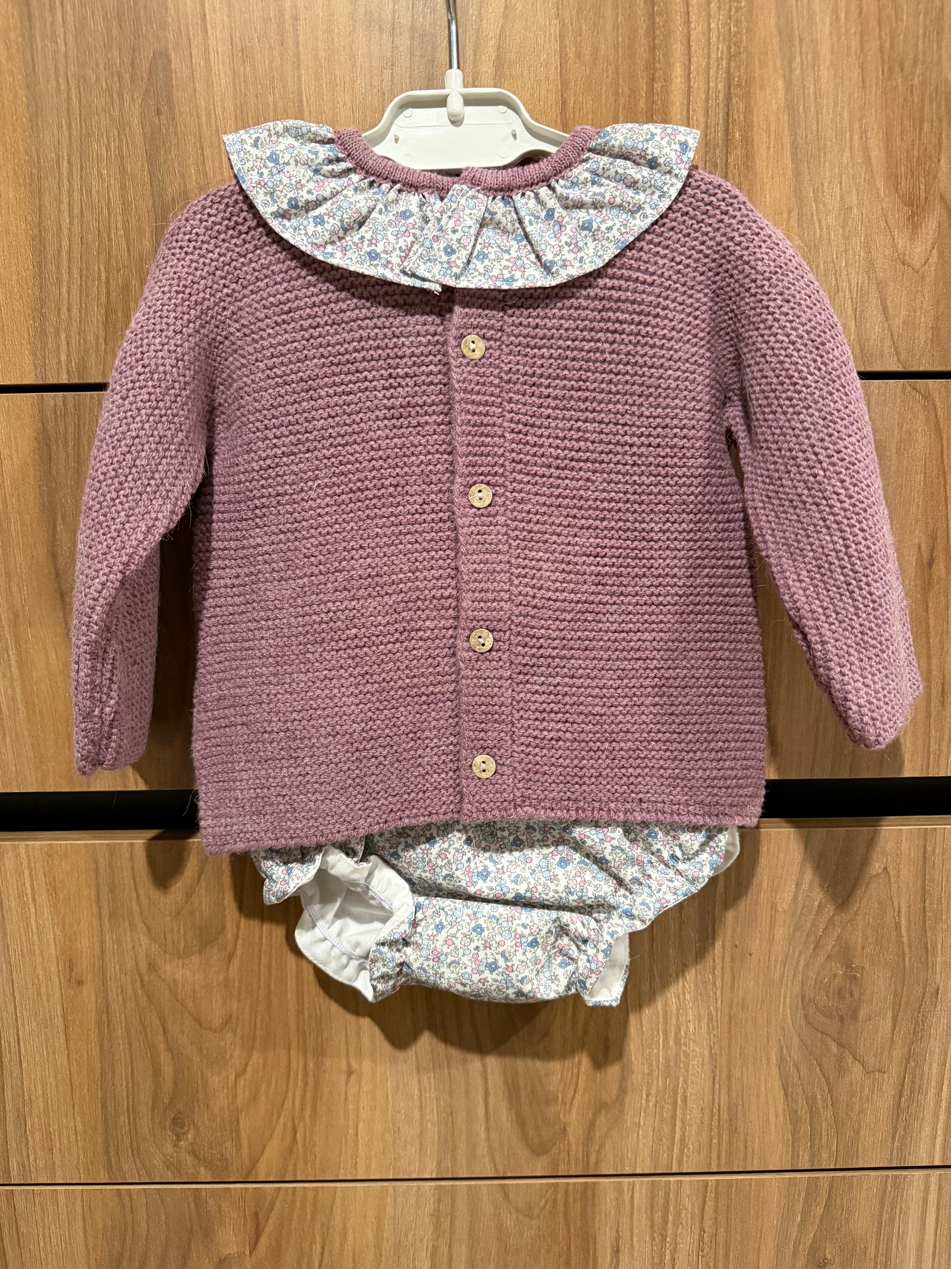 Precioso conjunto de cubre pañal y suéter/blusa de tejido de punto en coloro malva, imaginativo con unas mallas o unas calcetas altas. Ajuste de botones en la parte de la espalda, detalle de plan en cuello.