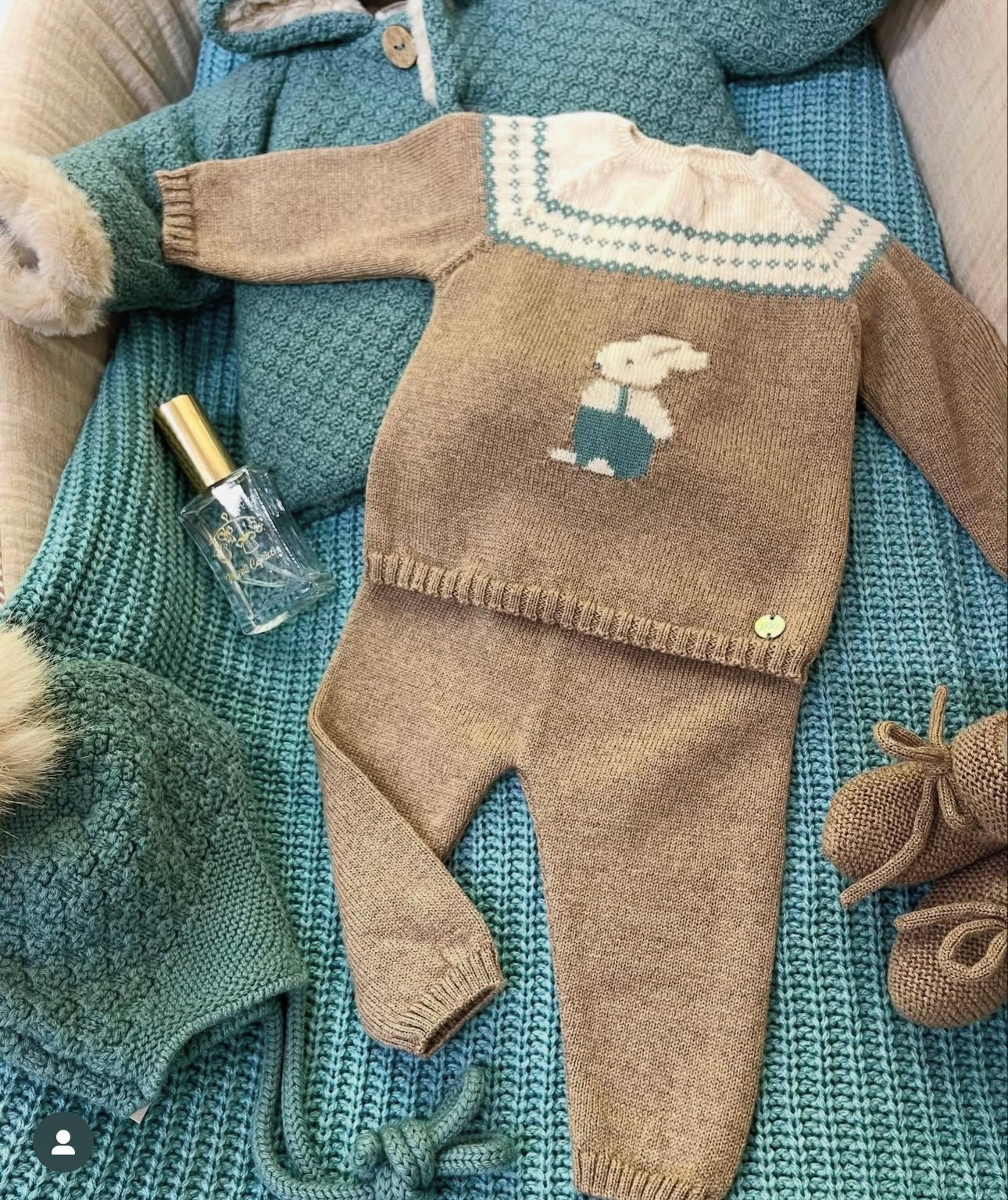 Conjunto divino de punto en color marrón con detalles en color crema y verde salvia, conejo en el pecho y pantalón si pies. Ajuste de botones en la parte de la espalda.