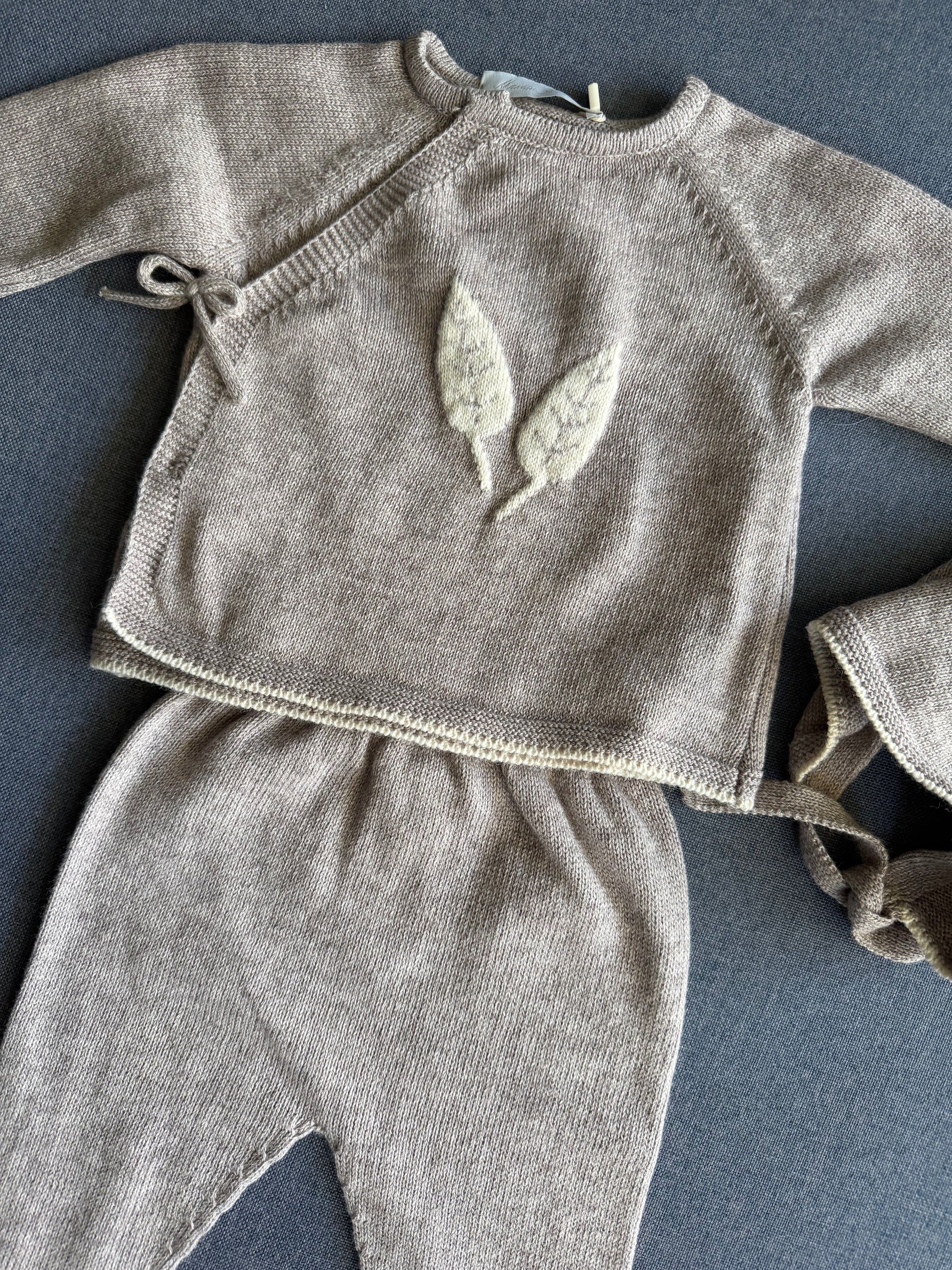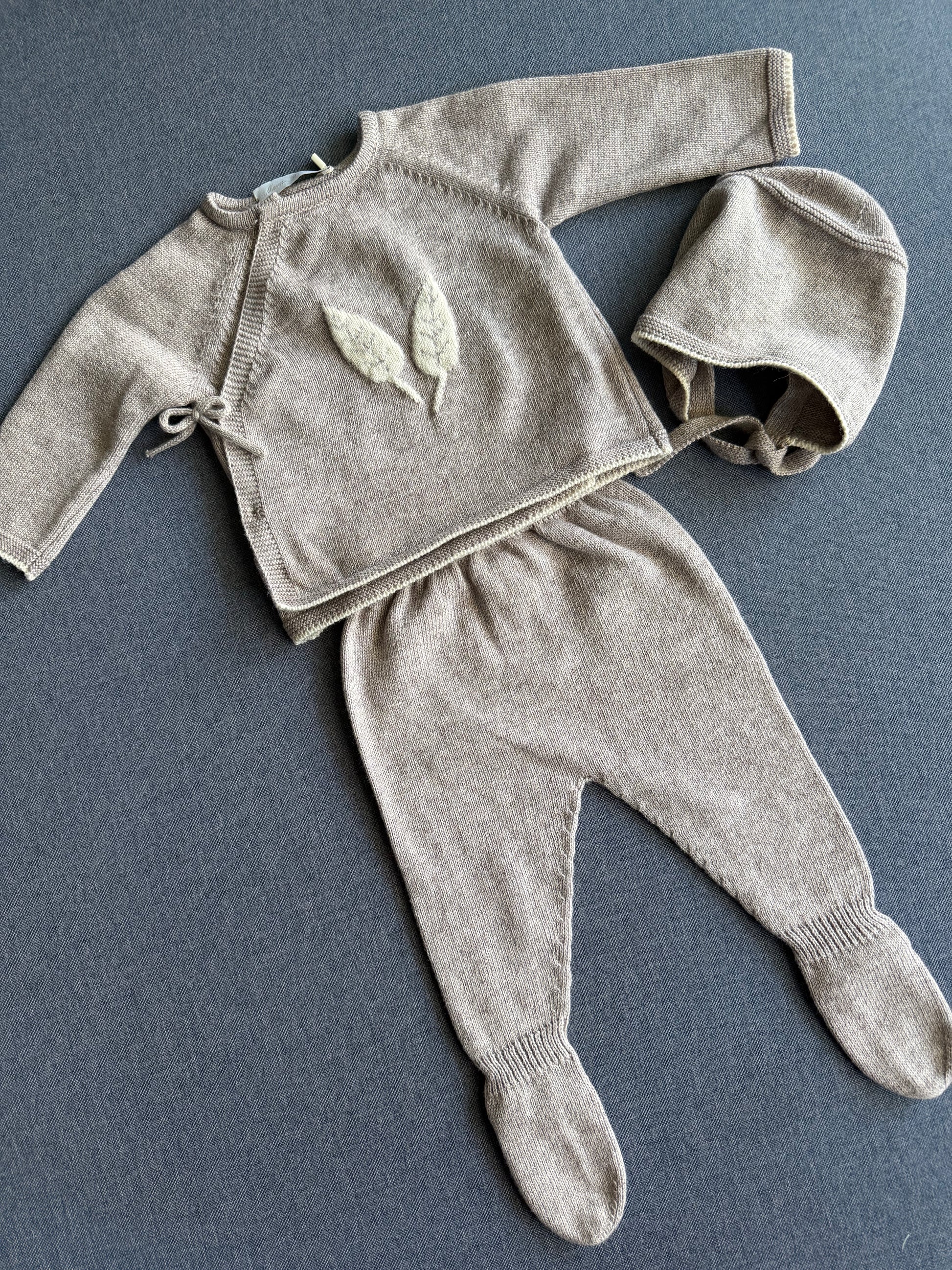 Hermoso conjunto unisex en color taupe, con detalle de hojas en el pecho y ajuste de cordón y botones a un lado para mayor facilidad.