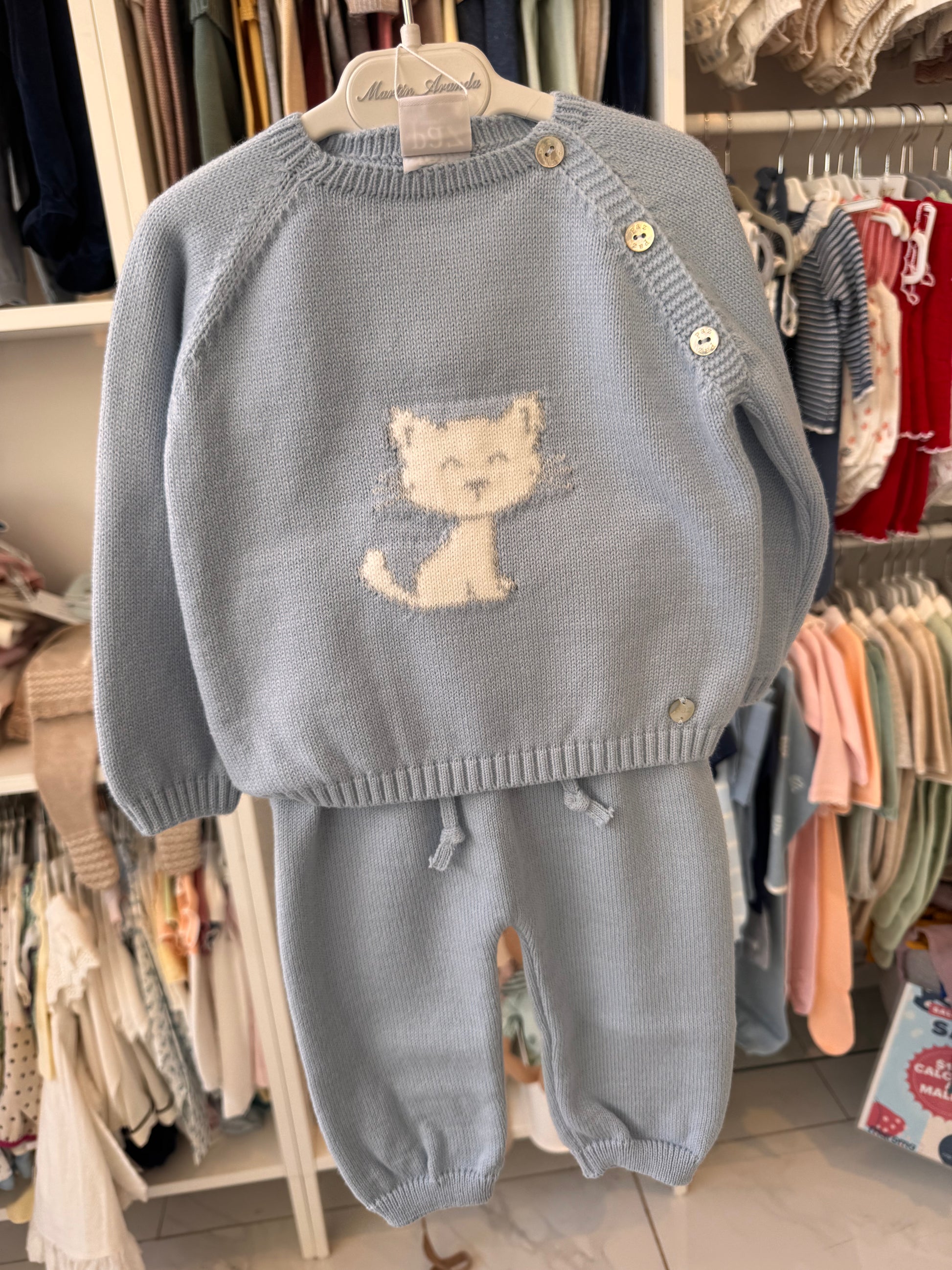 Precioso conjunto de punto en color azul nube con detalle de gatito en pecho, ajuste de botones laterales. Pantalón con resorte y ajuste en cintura.