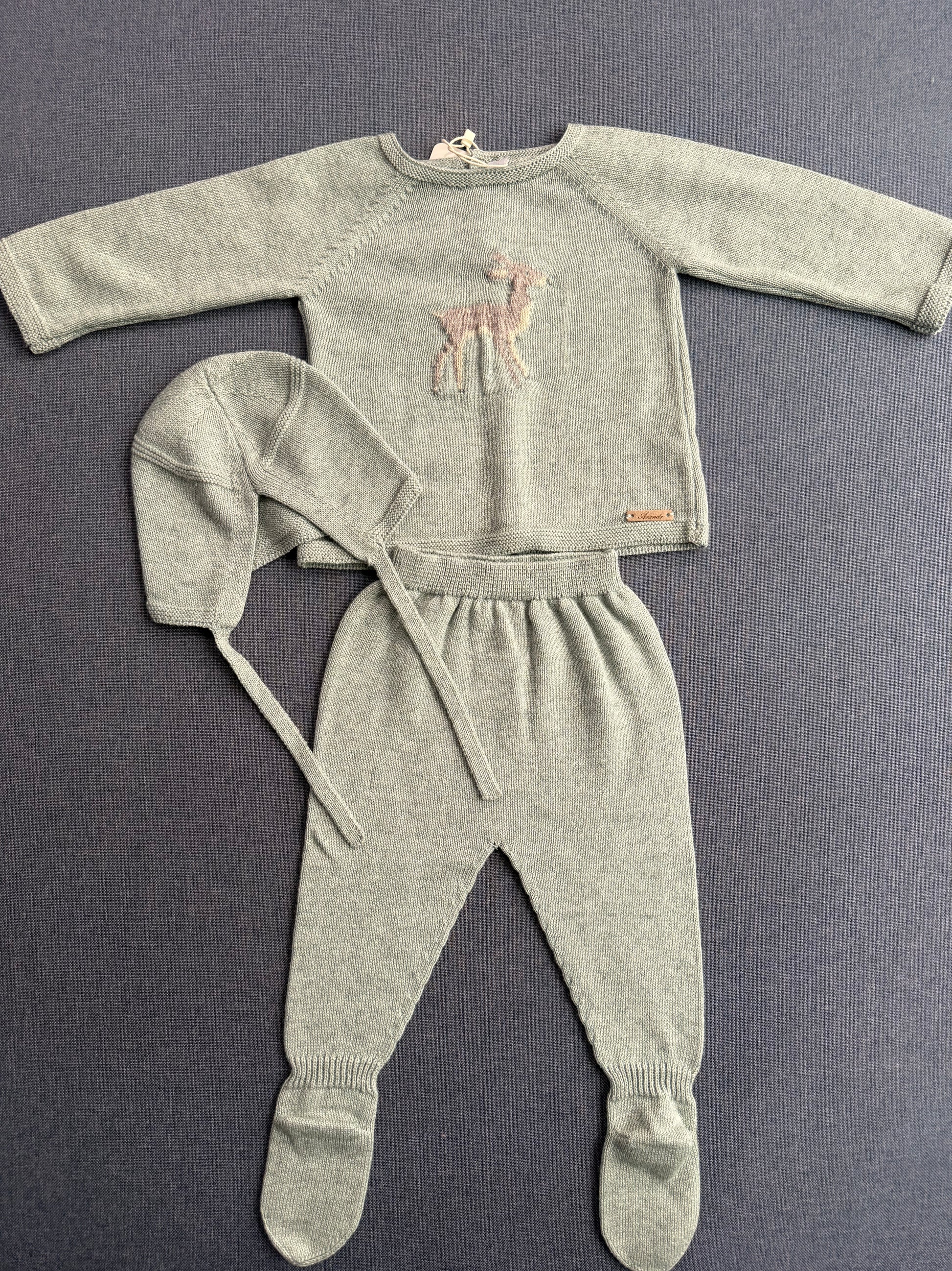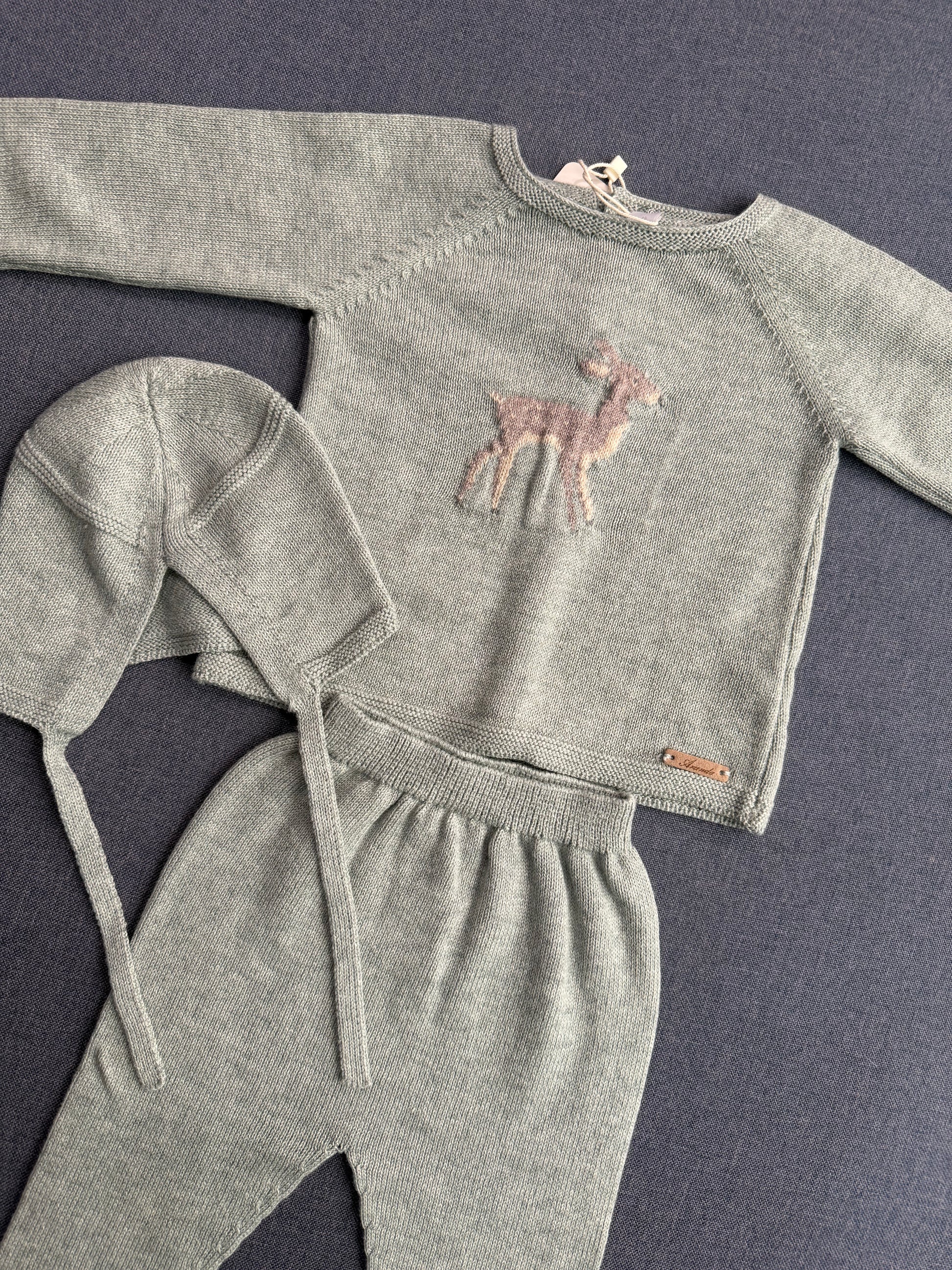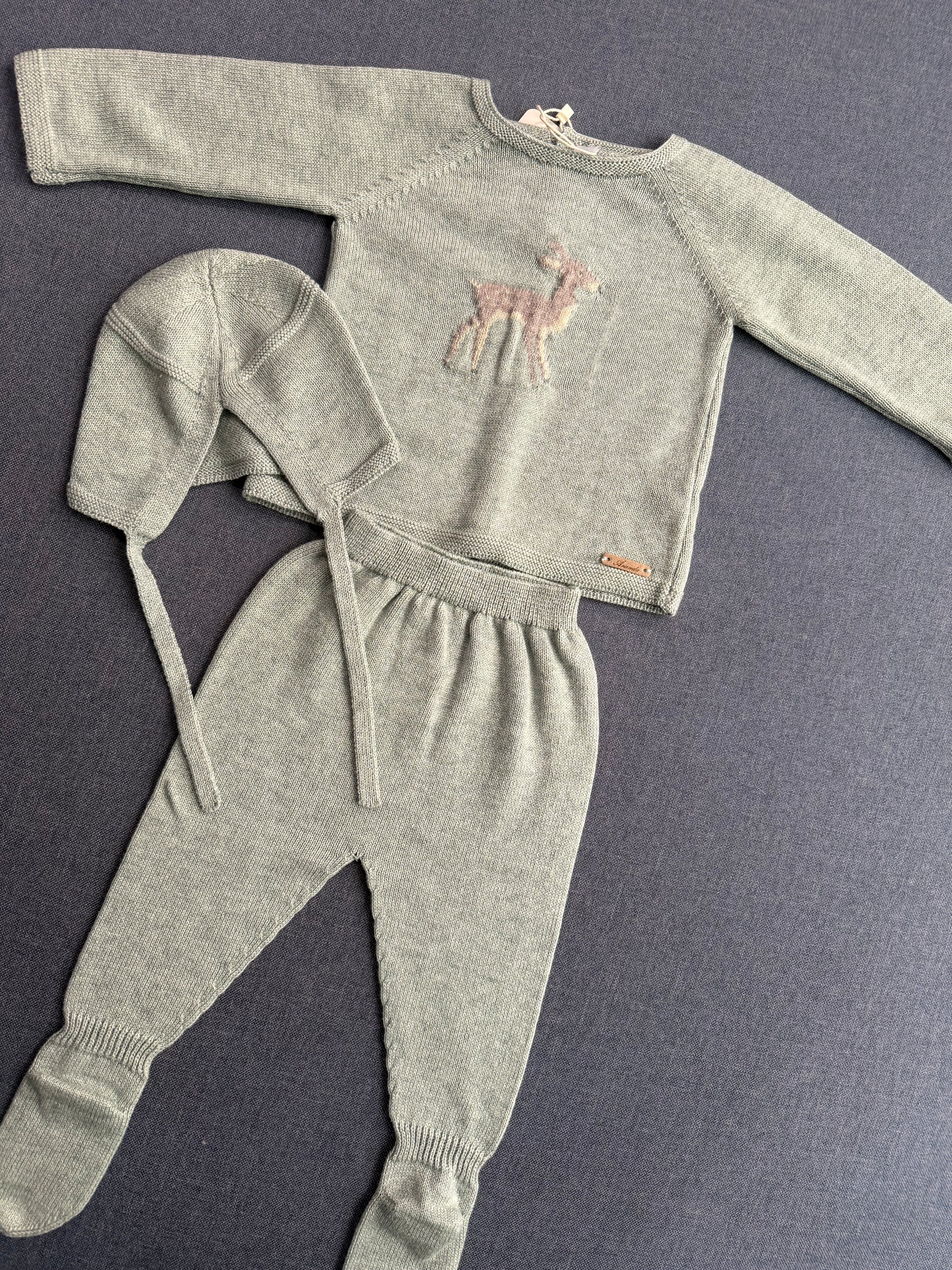 Hermoso conjunto de tres piezas en color verde clarito con detalle de ciervo en pecho, super lindo para cualquier temporada.