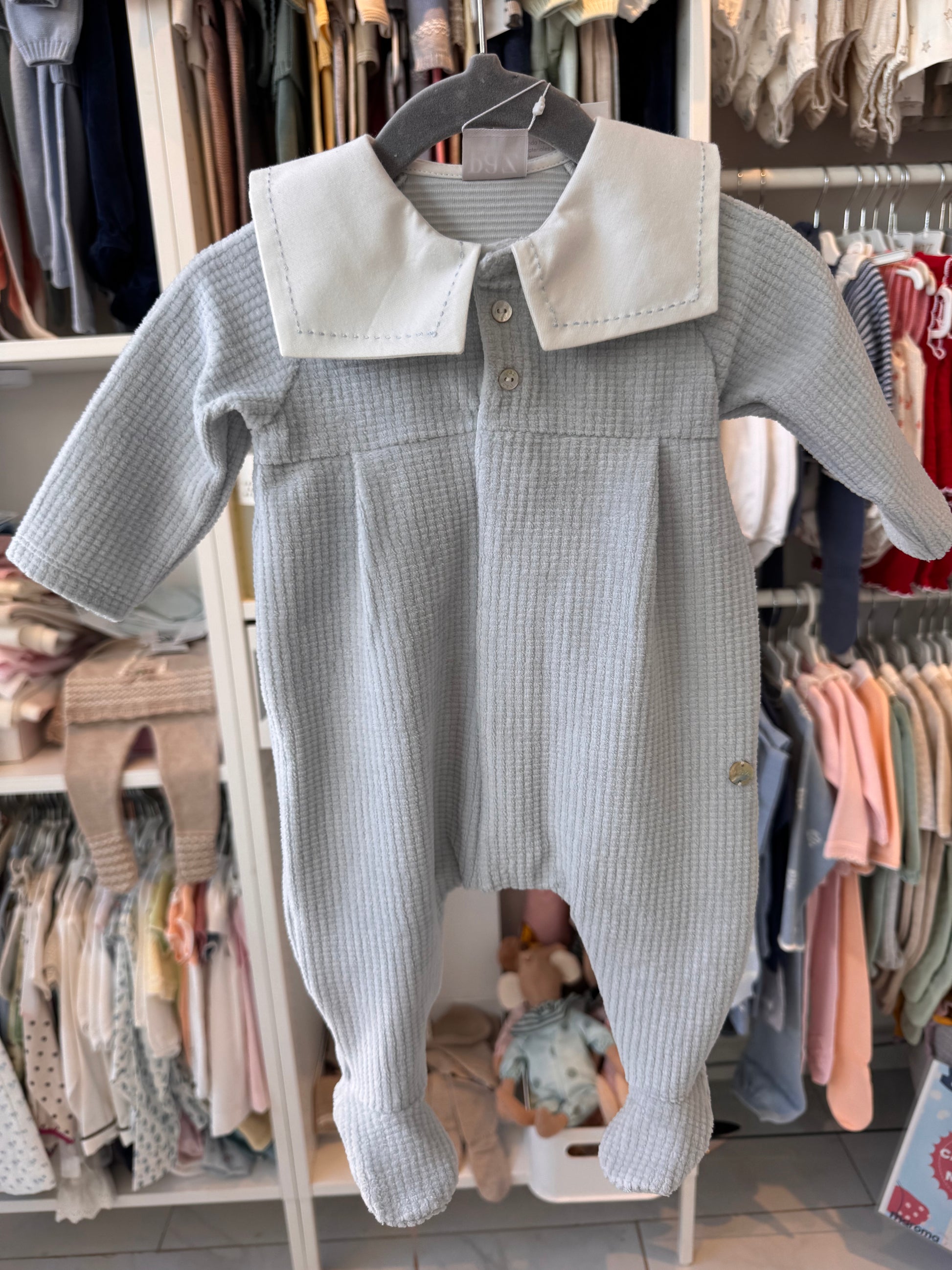 Hermoso pelele en tela color azul nube y detalles de tela en cuello color blanco muy elegante. Ajuste de botones en parte delantera y en entrepierna.