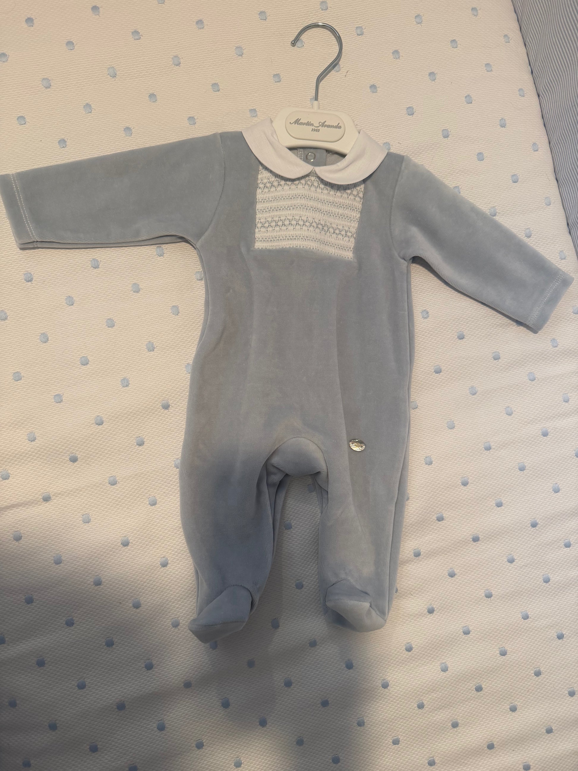 Precioso pelele en color azul claro con detalles en pecho y cuello, lindo y atemporal para tu bebé.