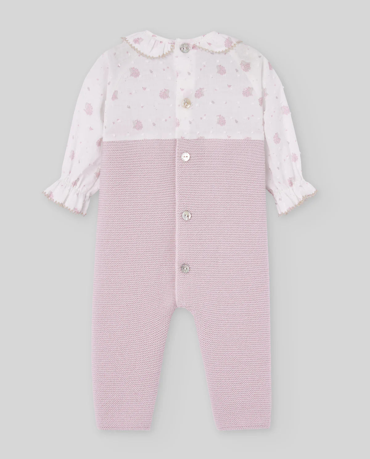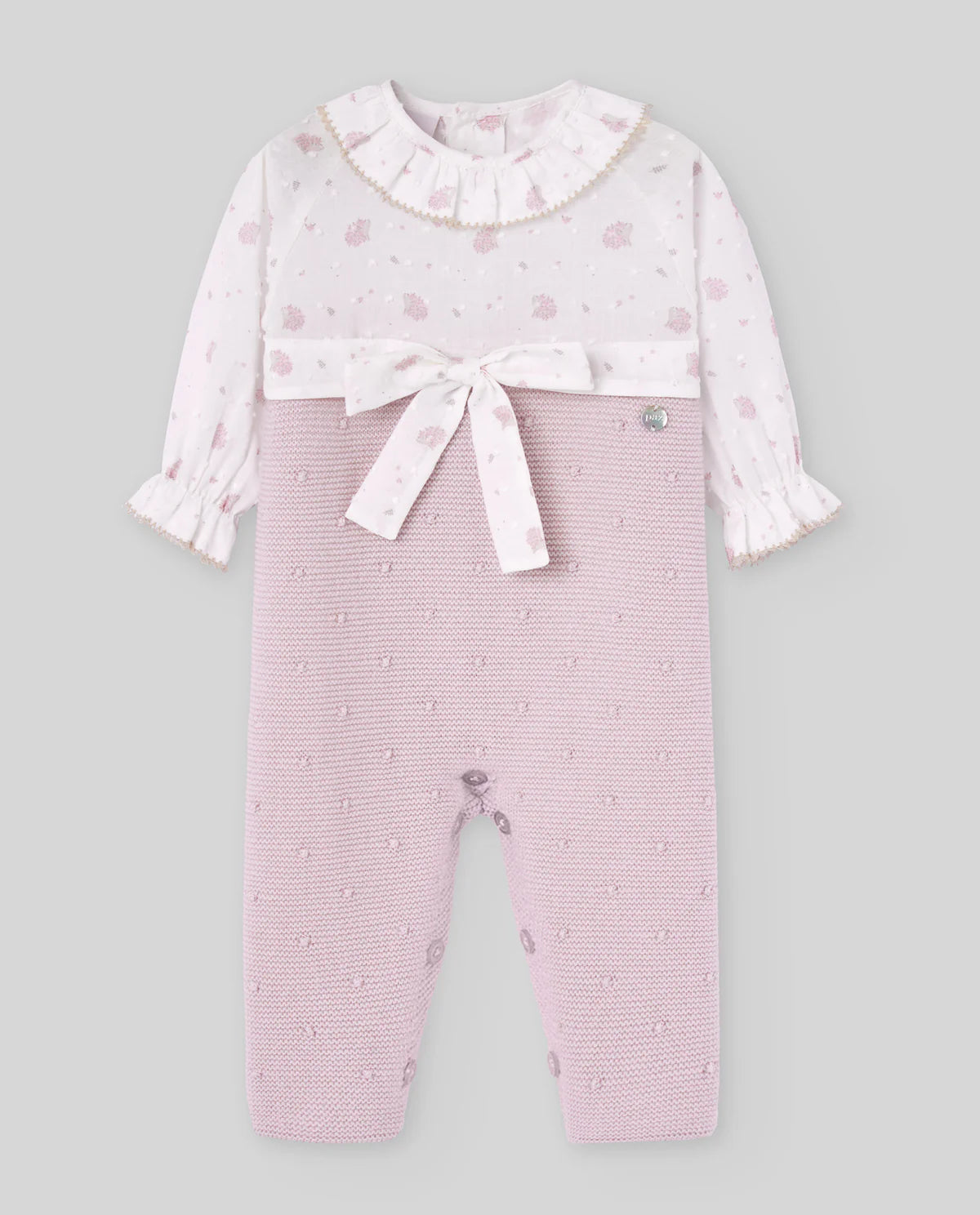 Un pelele unico, combinacion perfecta de tela y tejido de punto. En la tela print de erizos en un color lavanda rosado, lo amaras.