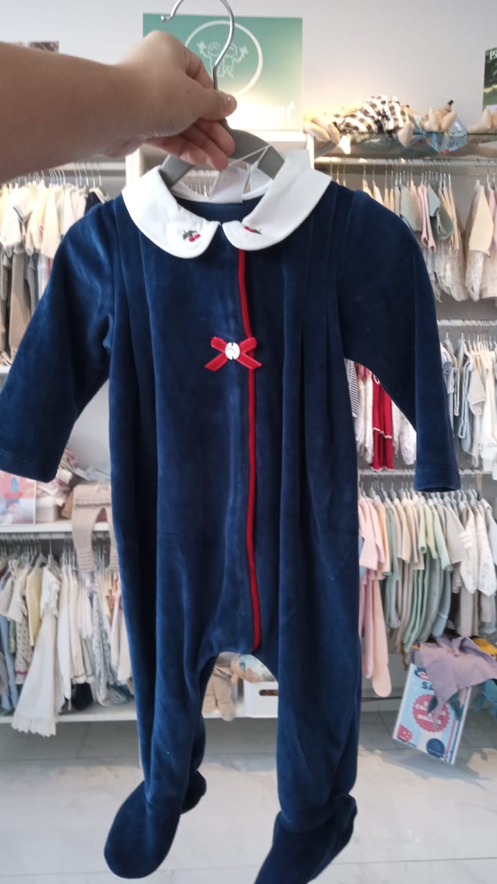 Precioso pelele para niña en color azul marino con detalles en color rojo y blanco en cuello con detalle de cerezas, botones en la parte delantera y en entrepierna para mayor facilidad.
