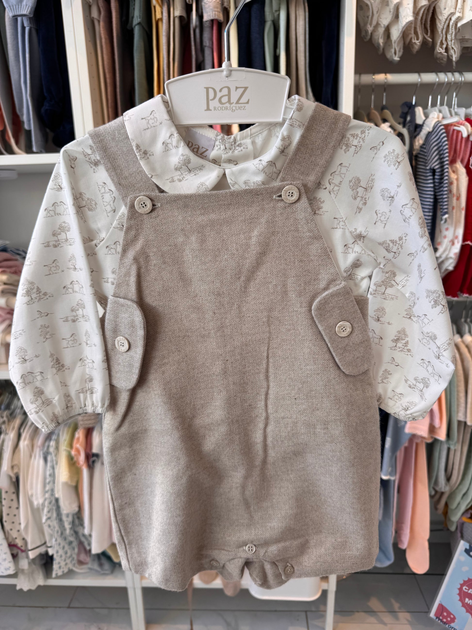 Divino peto en color cafe claro con camisa blanco y detalles de ponys, super linda y elegante combinación.