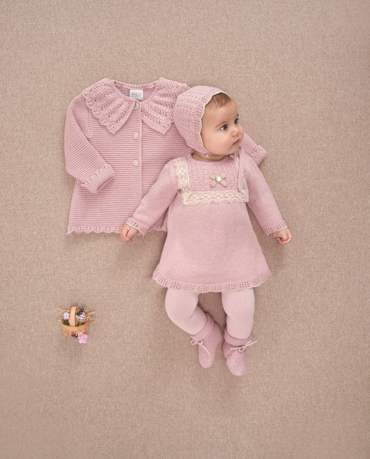 Hermoso vestido tejidito con detalles en pecho, ajuste de botones en espalda. Un must para tu pequeña en color rosa claro.
